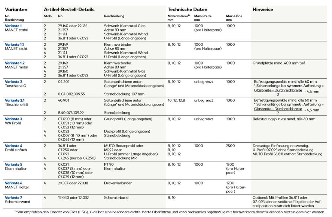 Die einsetzbaren Materialdicken und Scheibenmaße können je nach Variante unterschiedlich